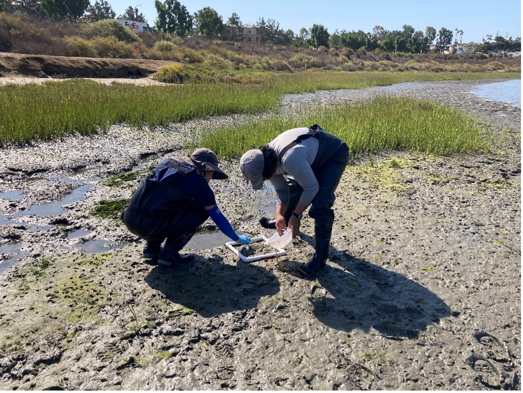 To better understand the impacts of pollution, aquatic life within the bay sediments is also routinely monitored. Monitoring is typically conducted on a boat, where staff collect grab samples of water and bottom sediment. Between July and September, we also monitor algae in the Upper Newport Bay Ecological Reserve, collecting algae samples from the mudflats during low-tide conditions.