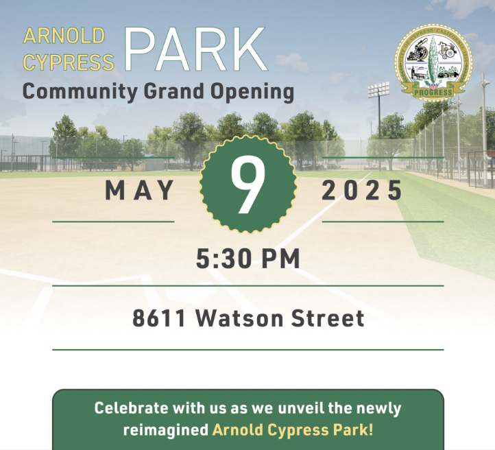 Celebrate the unveiling of the reimagined Arnold Cypress Park and honor the transformation of the city's oldest park. Stay tuned for additional event details!